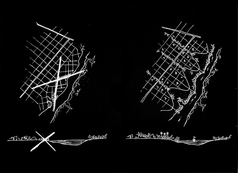 A partir de esta primera acción se definió tres estrategias. La primera fue la, re-definición de la red viaria. Sobre el tejido vial existente se propone una re-estructuración enmarcada en un enfoque de servicio a la comunidad, transporte, sostenibilidad y socialización. Dentro de esta se proponen una serie de proyectos en el espacio publico, la mas relevante corresponde a la implantación de grandes plazas abiertas equipadas con espacios teatrales que permitirán la recolección y evacuación de las inundaciones, estos equipamientos se ubican en intersecciones estratégicas de la nueva red viaria. De esta manera, a nivel de ciudad se acepta las condiciones de inundación.