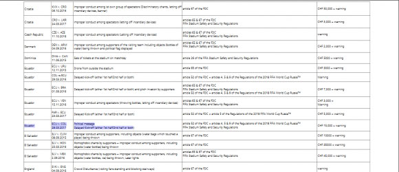 El documento confirma que la sanción enviada por la FIFA, declara a la Ecuafútbol como culpable de la violación del artículo 60 del mencionado reglamento con respecto al incidente ocurrido en el partido de la competición preliminar del Mundial Rusia 2018 entre Ecuador y Colombia en Quito.