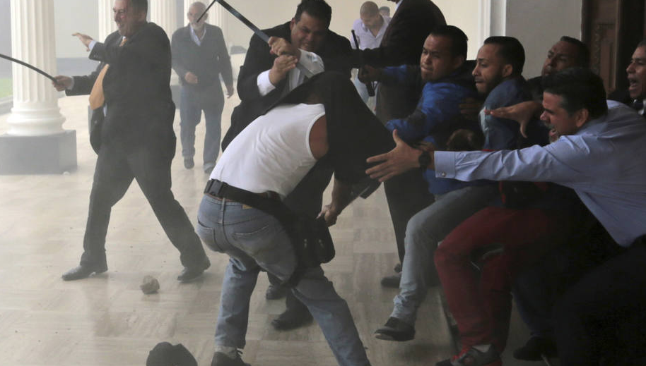 Los grupos de choque decían que actuaban en represalia al trancón (bloqueo) de seis horas organizado por la oposición en todo el país y aseguraron que permitirían la salida de los diputados y de los invitados al acto después de las 18:00. En las instalaciones del Poder Ejecutivo se encontraban 120 trabajadores, 108 periodistas y 94 diputados.