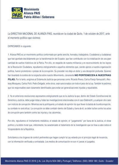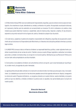 El comunicado acepta la excusa de Jorge Glas a sus funciones como vicepresidente del movimiento Alianza PAIS y exige que los procesados Ricardo Rivera, Carlos Pareja Yannuzzelli, Alecksey Mosquera, Carlos Pólit, Pedro Delgado, entre otros, sean sancionados con todo el peso de la ley.
