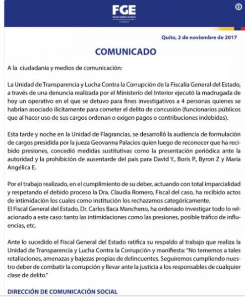Frente a esta situación, el fiscal general Carlos Baca Mancheno, ordenó investigar todo lo relacionado a este caso: tanto las intimidaciones, como las presiones, posible tráfico de influencias (…)