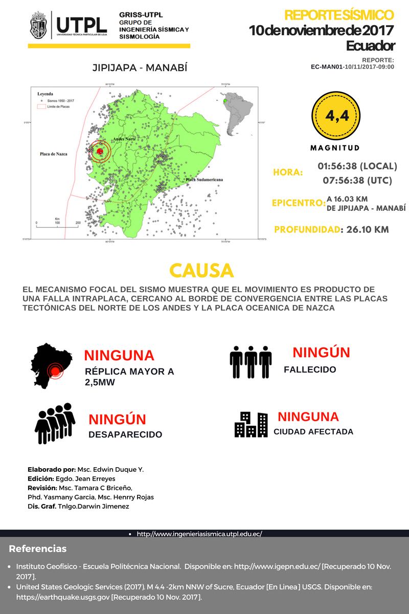 El Grupo de Investigación de Ingeniería Sísmica y Sismología de la Universidad Técnica Particular de Loja (GRISS, UTPL) reportó que el sismo que tuvo su epicentro a 16,03 kilómetros de Jipijapa, en Manabí, tuvo una magnitud de 4,4 grados y fue producto de una falla intraplaca, cercana al borde de convergencia entre las placas tectónicas del norte de los Andes y la placa oceánica de Nazca.