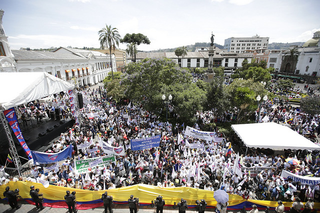 Larrea llegó a la Plaza Grande acompañado de cientos de seguidores que portaban banderas blancas con una imagen de un corazón, que representa su movimiento. La presencia de Moreno para agradecer ese apoyo se notó cuando salió al balcón acompañado de Larrea, su amigo de hace muchos años, con quien había estado reunido una media hora en el palacio presidencial.