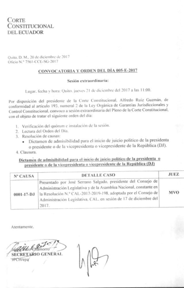 La convocatoria fue firmada por su presidente Alfredo Ruiz. El juez constitucional Manuel Viteri será el encargado de presentar el informe y sustanciar la causa; es decir, tiene que determinar si el pedido cumple con los requisitos legales y la causal planteada para el enjuiciamiento es constitucional o no.