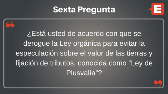 Definitivamente mi respuesta es Sí a la pregunta seis de la consulta popular convocada para el domingo 4 de febrero, debido a que el gobierno anterior cuando expidió la Ley Orgánica para Evitar la Especulación Sobre el Valor de las Tierras y Fijación de Tributo, incluyo cargas tributarias que distorsionan seriamente el mercado y que, en lugar de evitar la especulación sea en las zonas urbanas o rurales, ha frenado el sector de la construcción al afectar indiscriminadamente a grandes y pequeñas empresas del ramo.