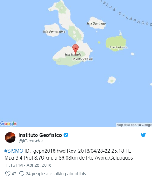 El Instituto Geofísico informó a través de su cuenta de Twitter de dos sismos que se registraron durante la noche del sábado en Galápagos. Ambos movimientos se dierón en la isla Isabela.