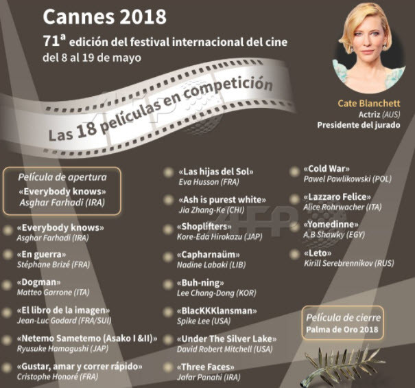 Los organizadores revelaron la lista de las 18 películas que serán juzgadas por un panel presidido por la actriz australiana Cate Blanchett. Solo tres mujeres cineastas figuran en la selección, que puede ser completada: la francesa Eva Husson con Les filles du soleil, la libanesa Nadine Labaki con Capharnaüm y la italiana Alice Rohrwacher con Lazzaro Felice.