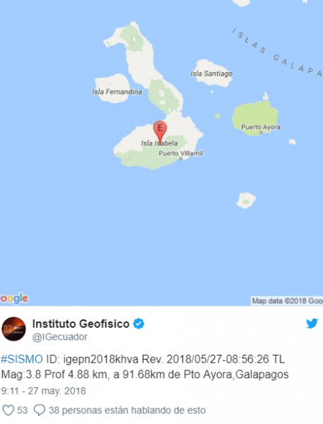 Un sismo de 3.8 grados de magnitud en la escala abierta de Richter se registró este domingo, 27 de mayo del 2018, en una isla del archipiélago de Galápagos, situado a unos mil kilómetros de las costas continentales ecuatorianas, informó el Instituto Geofísico de la Escuela Politécnica Nacional.