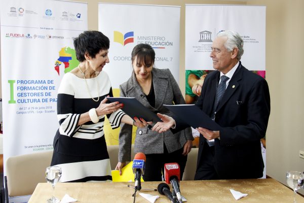 Mediante la intervención y apoyo de la Cátedra UNESCO de Cultura y Educación para la Paz – UTPL, el 27 de junio de 2018 se firmó un convenio entre la UTPL y UNESCO Quito que permitirá el fortalecimiento de programas de educación para que los futuros gestores de la paz puedan actuar desde una perspectiva sensible a la conflictividad, luchar contra la violencia en todos sus niveles, exigir y hacer cumplir los derechos humanos y trabajar bajo la premisa del desarrollo sostenible.