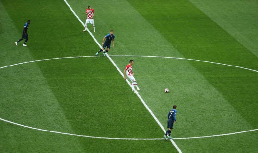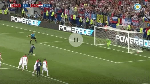 En un córner para Francia lanzando por Griezmann Perisic golpeó con la mano el balón tras la peinada de Giroud. El árbitro del encuentro, el argentino Néstor Pitana, recurrió al VAR y tras revisar la jugada en el monitor señaló el punto de penalti. Griezmann engañó a Subasic y volvió a adelantar a Francia antes del descanso.