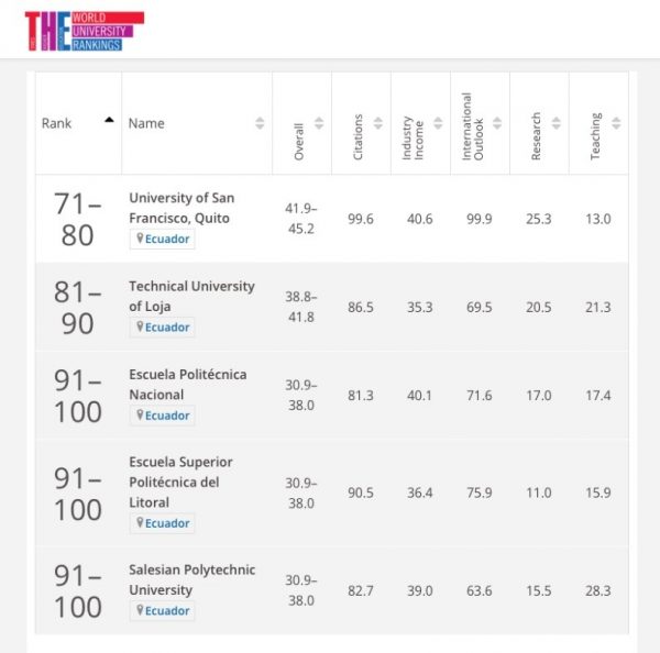 Dentro de este ranking lationoamericano, cuatro universidades ecuatorianas acompañan a la UTPL de acuerdo a sus puntajes obtenidos: Universidad San Francisco de Quito, Escuela Politécnica Nacional, Escuela Superior Politécnica del Litoral y Universidad Politécnica Salesiana. Con el trabajo de estas cinco instituciones, Ecuador alcanza el primer lugar en el ranking, dentro del pilar que mide el impacto de las citas bibliográficas de publicaciones científicas, con un puntaje promedio de 86.5.