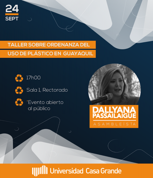 La asambleísta por el partido Social Cristiano – Madera de Guerrero, Dallyana Passailaigue, dirigirá un taller sobre la ordenanza municipal sobre el uso del plástico en la Universidad Casa Grande, en Guayaquil, a las 17:00 de este 24 de septiembre en un evento abierto al público.