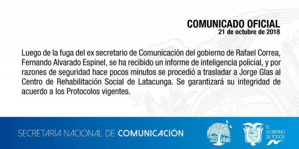 A través de un comunicado, la Presidencia de Ecuador informó a las 21:10 que el exvicepresidente fue sacado de la Cárcel 4 de Quito por razones de seguridad con un fuerte contingente policial. Asimismo, señaló que se garantizará su integridad de acuerdo a los protocolos vigentes.