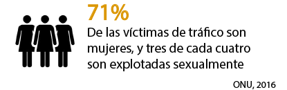 El 71% de las víctimas de tráfico son mujeres, tres de cada cuatro son explotadas sexualmente (ONU, 2016)