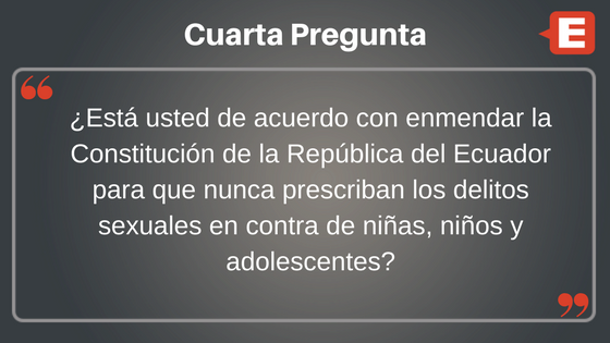 Resulta conveniente y oportuno que el presidente de la República, Lenín Moreno, haya incluido la imprescriptibilidad de los delitos sexuales en contra de niñas, niños y adolescentes, entre los temas que serán consultados a la ciudadanía en los comicios del próximo domingo 4 de febrero.