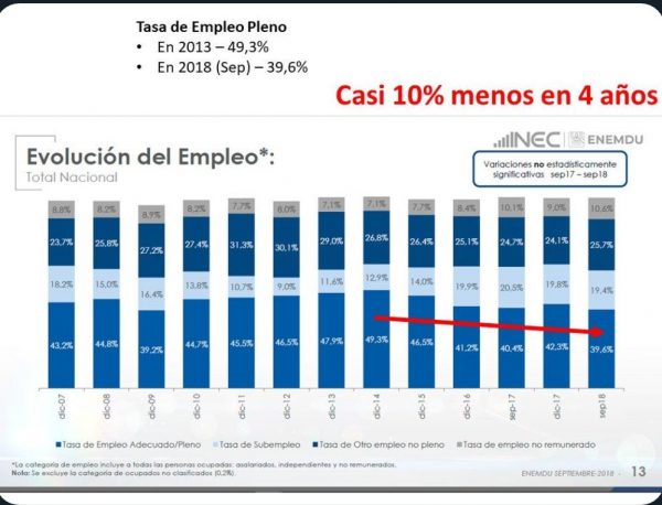 El 62% de los ecuatorianos no tiene un empleo adecuado. Eso dicen las estadísticas oficiales. Vamos a disgregar la cifra: de 8’100.000 (ocho millones cien mil) ecuatorianos que se encuentran en edad económicamente activa, tan solo 3’100.000 (tres millones cien mil) cuentan con empleo adecuado. Eso significa que 5’000.000 (cinco millones) no cuentan con un empleo que les permita sostener adecuadamente a sus familias.