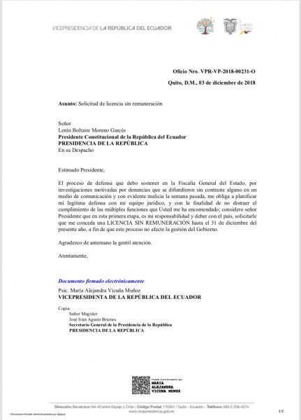 El presidente Lenín Moreno cesó de sus funciones a la vicepresidente María Alejandra Vicuña. Lo anunció la tarde de este lunes 3 de diciembre de 2018, durante la presentación de los nuevos ministros que integrarán el gabinete, en el Salón Amarillo del Palacio de Carondelet.