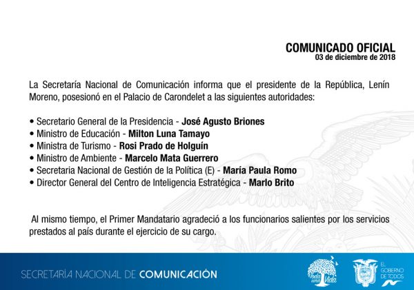 El presidente Lenín Moreno renovó su gabinete ministerial. Este lunes, 3 de diciembre del 2018, se oficializaron siete cambios de ministros y secretarios de Estado. El mandatario posesionó a José Agusto Briones, como Secretario General de la Presidencia, en lugar de Eduardo Jurado. Además, confirmó que Milton Luna asumirá la Cartera de Educación, en reemplazo de Fander Falconí, quién salió del Ministerio con cuestionamientos a la proforma presupuestaria del 2019. Además, Moreno encargó a la actual Ministra del Interior, María Paula Romo, la Secretaría de Gestión de la Política. El presidente aceptó la renuncia de Paúl Granda a ese cargo.