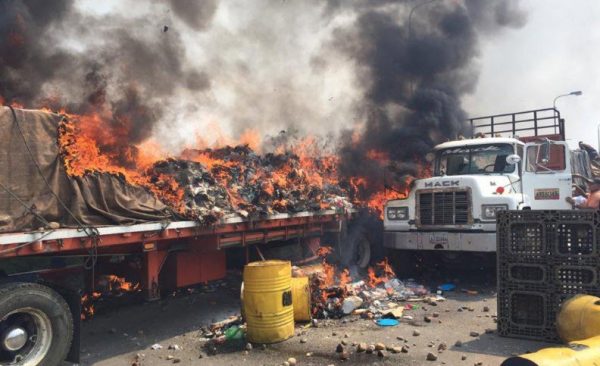 Uno de los camiones incinerados por los colectivos por orden de Maduro. Prefiere destruir comida y medicamentos que alimentar y sanar las enfermedades de su pueblo. pic.twitter.com/7tFQKZQLll