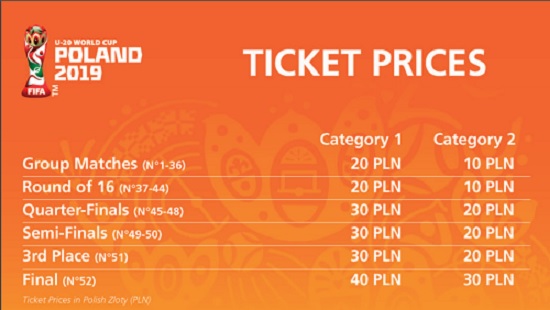 Las entradas para los partidos de la Copa Mundial Polonia 2019, en la categoría Sub-20 ya están disponibles en línea para su venta en todo el mundo, anunció la FIFA en un comunicado. Hasta el 5 de marzo a las 12:00, los titulares de tarjetas Visa tienen en exclusiva la oportunidad de solicitar sus tiquetes en FIFA.com/tickets/U20WC para presenciar el primer torneo del organismo mundial que se celebrará en suelo polaco.