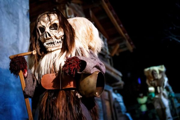Varias personas disfrazadas caminan por las calles del municipio de Blatten, en el valle de Lotschental (Suiza), el 1 de marzo de 2019. Durante el carnaval los participantes llevan máscaras de madera y pieles de animales con las que asustan a los lugareños.