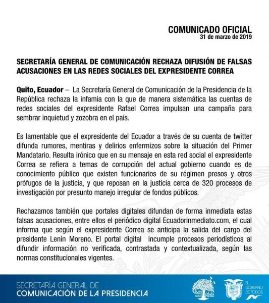 La Secom del gobierno de Lenín Moreno rechaza la campaña en redes sociales y otras plataformas con acusaciones contra el presidente a las que califica como falsas, entre ellas la salida anticipada del Presidente.