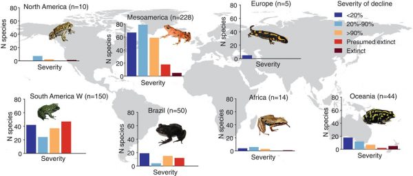 Número de especies de anfibios afectos por la enfermedad en cada continente. La mayoría de las extinciones han ocurrido en América del Sur