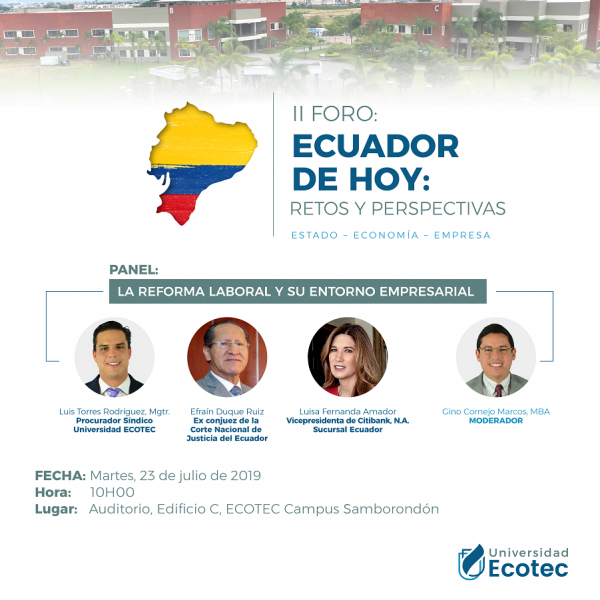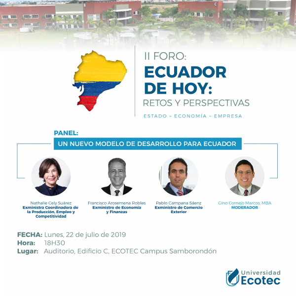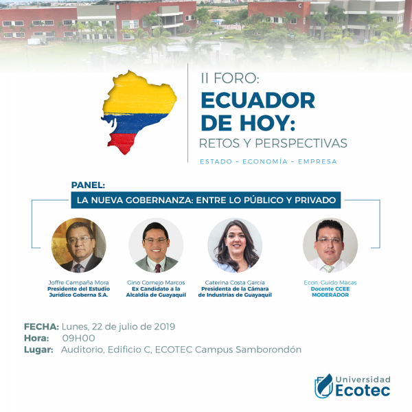 El Foro Económico se dará durante tres días continuos desde lunes 22 al miércoles 24 de julio en el Campus Ecotec Samborondón y Campus Juan Tanca Marengo, en la mañana 09h00 y la jornada de la tarde 18h30. Contará con 6 paneles de expertos y Conferencia Magistral de Cesar Litardo Caicedo, Presidente de la Asamblea Nacional del Ecuador.