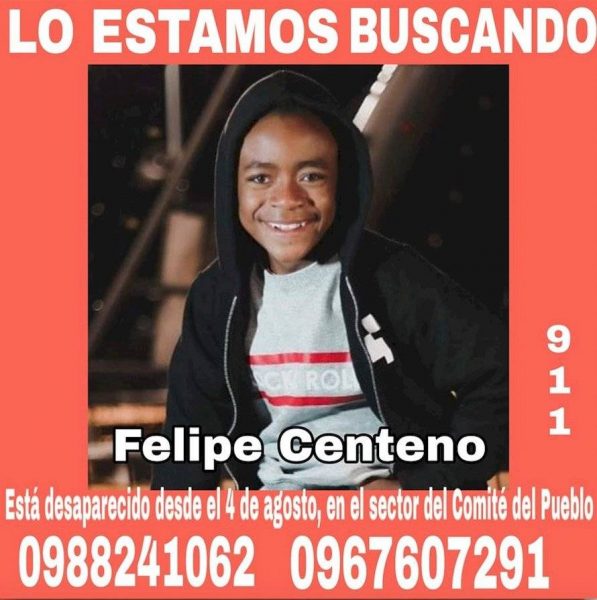 Felipe, de 14 años, fue visto por última vez en el Comité del Pueblo, norte de Quito. El día de su desaparición vestía una chompa verde, jean azul y zapatillas plomas. En redes sociales familiares y amigos se encuentran en la búsqueda del menor y solicitan que se ayude a difundir la información para encontrarlo.