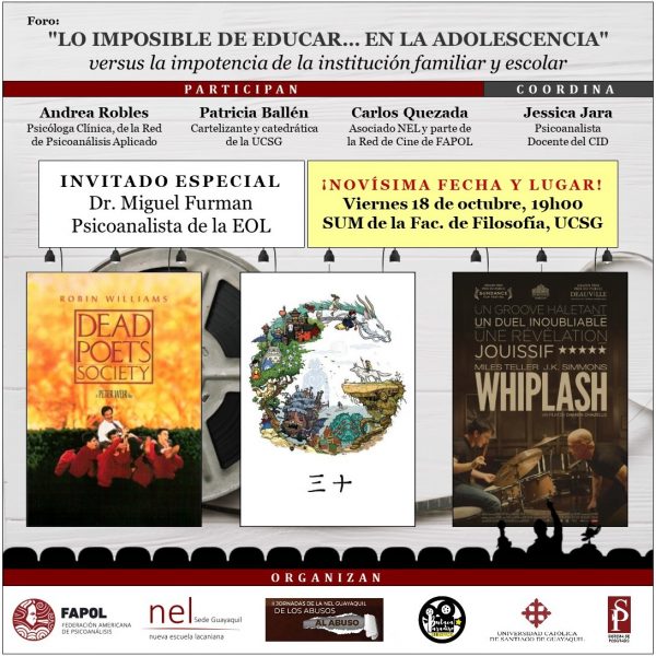 Desde el Observatorio “Legislación, derechos, subjetividades contemporáneas y el psicoanálisis” de FAPOL y la Nueva Escuela Lacaniana, nos hemos propuesto trabajar tres inflexiones, en relación a los tres imposibles freudianos: gobernar, educar y curar. En esa vía, hemos desplegado una serie de conversaciones en la Universidad Católica de Santiago de Guayaquil y la Universidad Casa Grande. Este será nuestro cuarto encuentro, el segundo en torno a lo imposible de educar, y tendrá lugar en el Auditorio de la Facultad de Filosofía de la Universidad Católica de Santiago de Guayaquil.