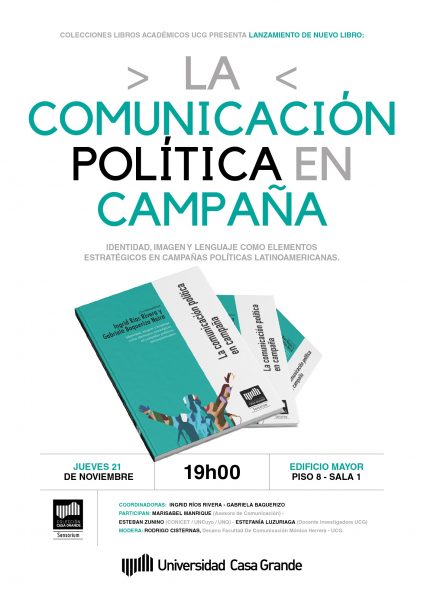 La comunicación política en campaña, un libro editado por la Universidad Casa Grande, bajo la coordinación de Ingrid Ríos Rivera y Gabriela Baquerizo Neira, será presentado este jueves 21 de noviembre a las 19:00 en el piso octavo del Edificio Mayor de ese centro de estudios, en Guayaquil.