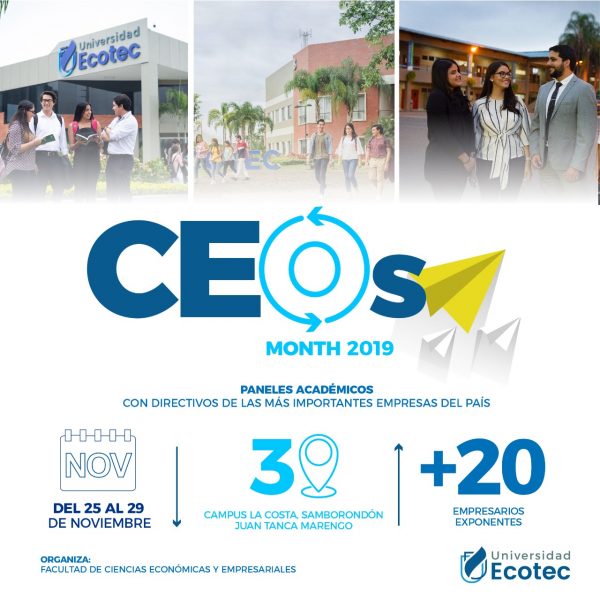 La Universidad ECOTEC y la Facultad de Ciencias Económicas y Empresariales organiza el encuentro de Chief Executive Officers, CEOs Month 2019 desde este lunes 25 hasta el 26 de noviembre y el 27 y 29 del mismo mes