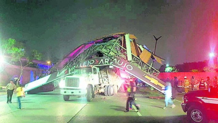 El puente para cruce de transeúntes quedó destruido. Dos personas que circulaban en un auto que quedó debajo de la estructura, resultaron heridas.