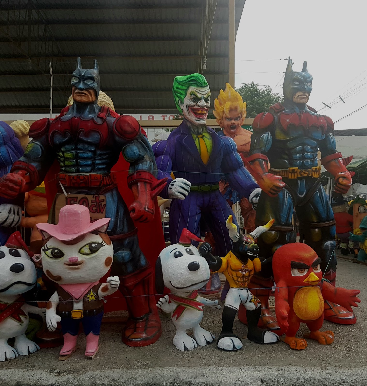 En las aceras, decenas de monigotes de vivos colores y diversos tamaños se entremezclan con variadas caretas. Y aunque ya no son tan frecuentes como antes, también siguen comercializándose monigotes que representan a los políticos, por lo general al gobernante de turno o líderes de la oposición.