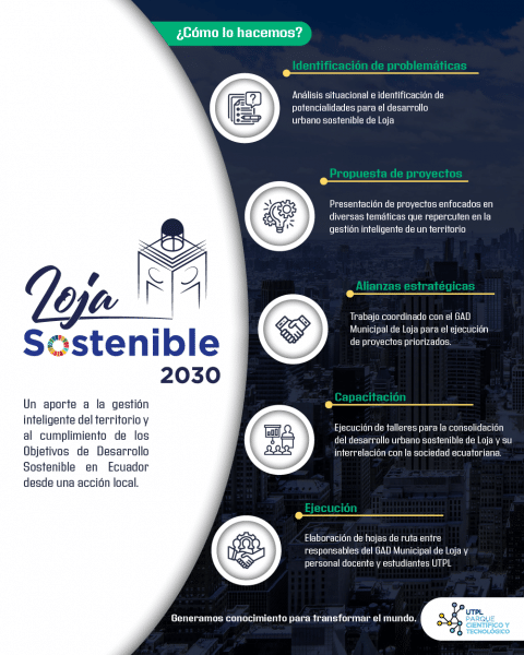 Enfocados en esta finalidad, en octubre de 2018 surge una iniciativa conjunta entre la Universidad Técnica Particular de Loja (UTPL) y el Gobierno Autónomo Descentralizado Municipal del cantón Loja para trabajar en el proyecto “Loja Sostenible 2030”, una propuesta en la que se plasman los desafíos de una ciudad intermedia para alcanzar una gestión sostenible inspirada en el cumplimiento de los ODS.