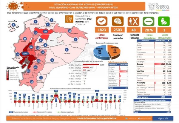 El Servicio Nacional de Gestión de Riesgos y Emergencias de Ecuador confirmó que los muertos por coronavirus en Ecuador subieron a 48; el número de contagiados llegó 1.823; hay 2.503 casos con sospecha y 2.076 casos descartados y tres recuperados.