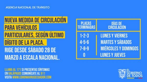 Las autoridades insisten en que los ciudadanos se mantengan en sus hogares, de ahí que desde este sábado 28 de marzo comenzaba la restricción vehicular por el último dígito de la placa. Un total de 23 de las 24 provincias ecuatorianas presentan casos.