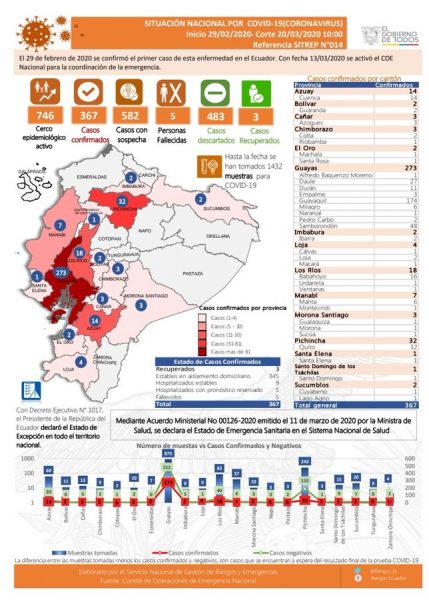 Tiempo de lectura: < 1 minutoEn la mañana de este viernes 20 de marzo, Alexandra Ocles, directora del Servicio del Gestión y Emergencias (Sngre), informó que hay 367 personas contagiadas por el coronavirus covid-19 en el Ecuador, mientras que el número de fallecidos se elevaron a 5. El informe que recoge datos hasta las 08:00 de hoy señala a Guayas como la más afectada por los contagios, con 273 casos, Guayaquil, su capital, tiene 174 casos.