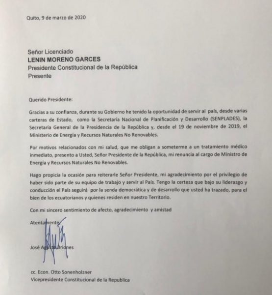 José Agusto Briones, quien asumió el cargo de ministro de Energía y Recursos Naturales no Renovables desde el 19 de noviembre de 2019, en reemplazo de Carlos Pérez, este lunes 9 de marzo, remitió una carta a Lenin Moreno, presidente de la República, presentando su renuncia.