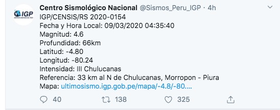 Un sismo de 4.6 grados en la escala de Richter se registró en la frontera entre Ecuador y Perú la madrugada del lunes 9 de marzo del 2020. Según el Centro Sismológico de Perú, el epicentro se localizó a 33 km al norte de Chulucanas, Morropon en Piura. Usuarios de redes sociales reportaron que el sismo también se sintió en las provincias ecuatorianas de El Oro, Loja y Zamora.