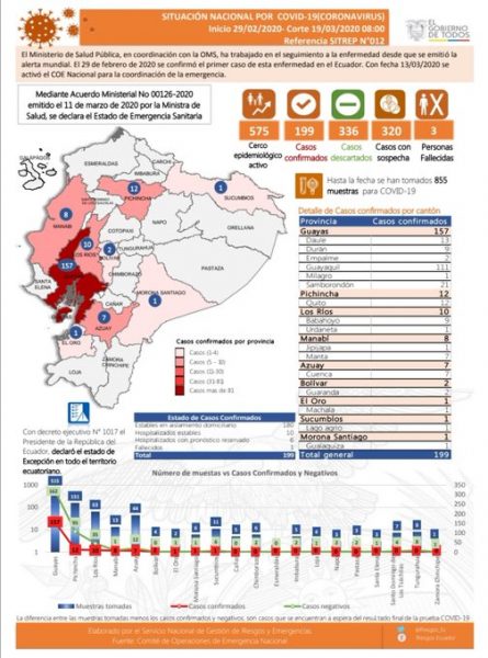 Alexandra Ocles, secretaria de Gestión de Riesgos, informó la mañana de este jueves 19 de marzo del 2020 que hay 199 casos confirmados con covid-19 en el Ecuador. La provincia de Guayas, en el suroeste y cuya capital es Guayaquil, tiene la mayor cantidad de personas contagiadas con 157 casos, seguido de Pichincha con 12 pacientes. La provincia costera de Los Ríos (suroeste), tiene 10 casos, seguida de Manabí con 8, Azuay con 7, Bolívar con 2 y El Oro, Sucumbíos y Morona Santiago con un paciente cada una. En el país están habilitados 27 hospitales públicos para la atención de posibles casos de coronavirus, y el tratamiento de pacientes que den positivo. Además, el Gobierno Nacional llegó a un acuerdo con laboratorios privados para que realicen las pruebas, bajo autorización médica.
