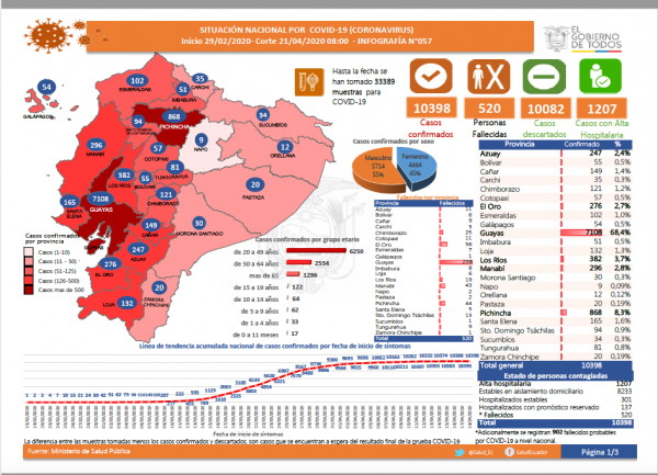 Tiempo de lectura: < 1 minutoSegún el último reporte del Ministerio de Salud ascienden a 10 398, los casos confirmados de Covid-19, actualizado hasta la mañana de este martes 21 de abril. Las cifras fueron confirmadas por la ministra de Gobierno María Paula Romo, en cadena nacional.