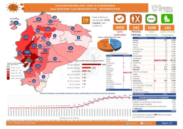 En total se registran 242 muertos por Covid-19; unos 4.450 casos confirmados, de estos 3.744 personas estables en aislamiento domiciliario; 178 personas estables que están hospitalizadas; 146 personas hospitalizadas con pronóstico reservado y 140 personas que han sido dadas de alta hospitalaria.