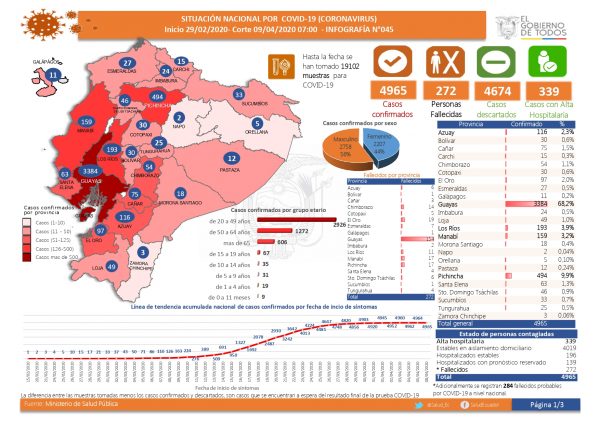 En cuatro provincias, aseguró Romo, el contagio ya es comunitario, las que registran más de 100 casos, como establece la norma sanitaria: Guayas, Pichincha, Los Ríos y Azuay.