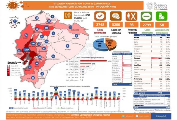 El Ministerio de Salud ha tomado 8.747 muestras para COVID-19. Del total de casos confirmados el 54% corresponde a hombres, el equivalente a 1.493 casos. Guayas sigue siendo la provincia con más casos: 1.937, equivalente al 70,5% del total.