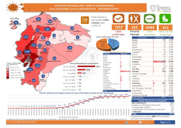De las 22.649 muestras tomadas hasta el 11 de abril se registran 7.257 casos positivos; de esos, 411 pacientes recibieron el alta hospitalaria y 184 personas siguen hospitalizadas con pronóstico reservado; además existen 6.944 casos descartados y 315 personas fallecidas. La estadística también registra 338 fallecimientos, casos sospechosos de haber sido portadores del coronavirus.