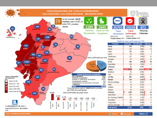 Con corte a las 11:00, de este martes 28 de abril, la cifra de contagiados asciende a 24258 y 871 fallecidos, aunque hay 1212 fallecidos probables por el virus, según lo sinformó al Ministra de Goberino, María Paula Romo.