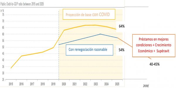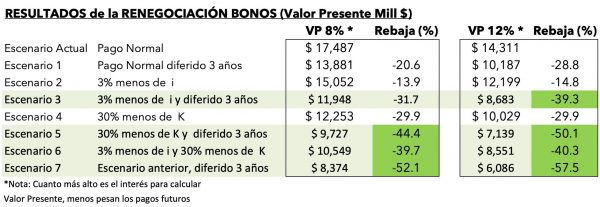 ¿Cuál de estas opciones estarán esperando los tenedores de bonos? Lo que algunos señalan es que una combinación quizás aceptable sea: rebaja del capital de alrededor del 15%, rebaja de los intereses hacia el 2% durante unos años para luego subir al 6%, y que se difieran los pagos de capital (pero no de intereses) hasta el 2024 o 2025.