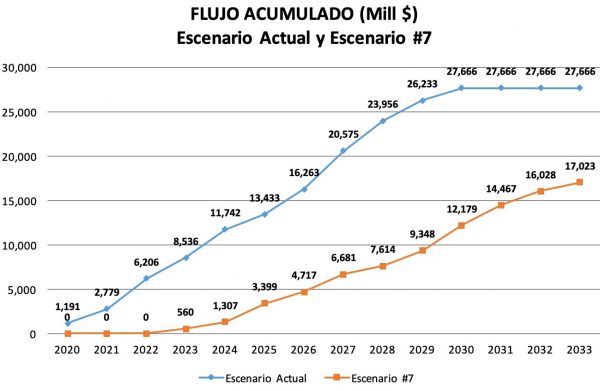 Por supuesto el caso ideal es la combinación de las 3 opciones (escenario 7), lo que nos lleva a una rebaja en Valor Presente de más del 50%, y hay varias otras opciones que nos dan una rebaja del orden del 40%. Y está claro que cualquier opción debe incluir un diferimiento de pagos en los primeros años para aliviar la carga en esta época tan complicada (el gráfico #4 compara el escenario actual con el mejor)