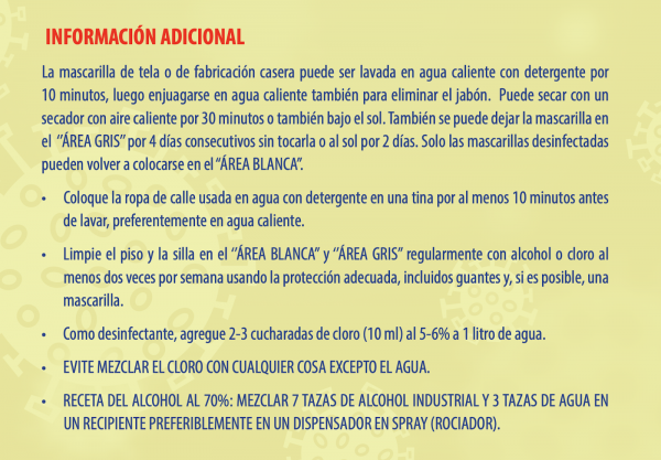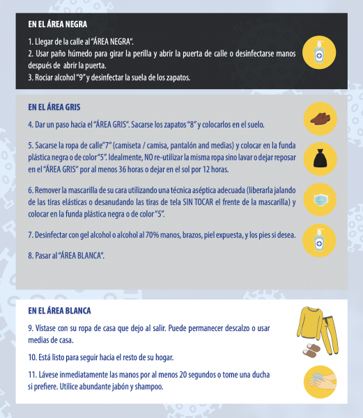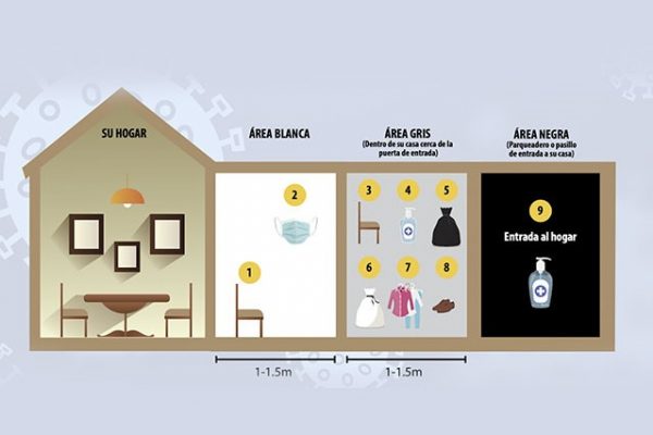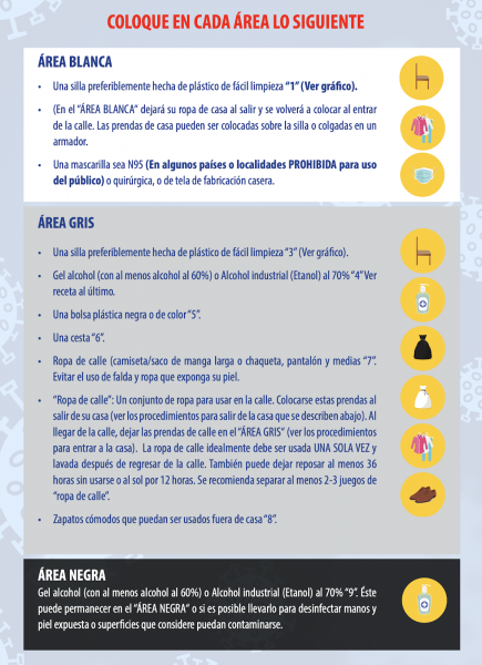Área gris. – Corresponde a un espacio de 1-1.5 m2 al lado de la puerta de salida de su casa que será en el área de descontaminación. Aquí se preparará para salir a la calle o para entrar al hogar).